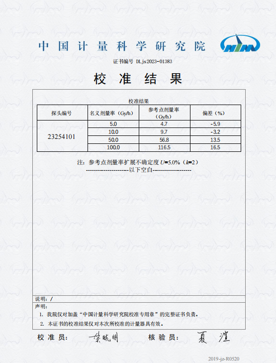 过载特性 | 低量程管在1 Sv/h、高量程管在1000 Sv/h,辐射场中暴露5分钟,不会引起辐射探测器的损坏 | |